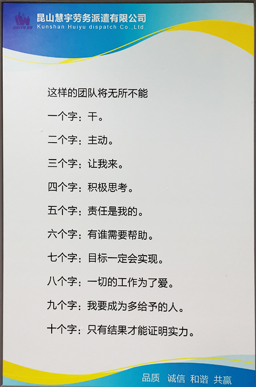 昆山慧宇勞務(wù)派遣有限公司成立于2010年,經(jīng)昆山市市場監(jiān)督管理局登記,集國內(nèi)勞務(wù)派遣,物業(yè)管理,企業(yè)管理服務(wù)、非行政許可商務(wù)信息咨詢;職業(yè)中介、人才中介等為一體的大型合法勞務(wù)機構(gòu)。公司秉承“品質(zhì)、誠信、和諧、共贏”的宗旨,保持嚴謹自律的工作作風;遵紀守法,嚴格按照勞動相關(guān)法律作業(yè);經(jīng)昆山人力資源和社會保障局核發(fā)【勞務(wù)派遣經(jīng)營許可證】及【人力資源服務(wù)許可證】資質(zhì)的專業(yè)勞務(wù)服務(wù)公司。
